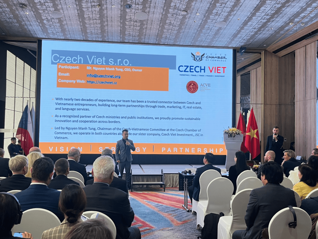 Lĩnh vực mà các doanh nghiệp Séc quan tâm tại Việt Nam tập trung vào công nghệ môi trường, thiết bị y tế, công nghệ thông tin, năng lượng, thực phẩm và bảo hiểm. Những lĩnh vực này phù hợp với định hướng thu hút đầu tư chất lượng cao, phát triển bền vững và chuyển đổi số của Việt Nam. Trong khu vực doanh nghiệp tham dự, Công ty CZECH VIỆT – doanh nghiệp Séc gốc Việt duy nhất trong đoàn – do anh Nguyễn Mạnh Tùng sáng lập, nổi bật với vai trò cầu nối giữa doanh nghiệp hai nước. Anh Tùng hiện là Chủ tịch Ban Đối ngoại Việt Nam thuộc Phòng Thương mại Séc, góp phần thúc đẩy hợp tác kinh doanh song phương.
