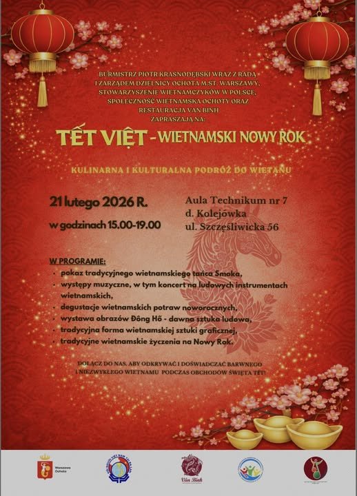 Quận Ochota (Warszawa) trân trọng mời cư dân và cộng đồng tham dự sự kiện “Tết Việt trên quận Ochota”, một lễ hội văn hóa đặc sắc, rực rỡ sắc màu và tràn đầy năng lượng, sẽ diễn ra vào ngày 21/2/2026, từ 15:00 đến 19:00, tại Hội trường Technikum số 7 (tòa nhà cũ Kolejówka), số 56 phố Szczęśliwicka. Đây là dịp đặc biệt để cùng nhau kỷ niệm Tết Nguyên đán – một trong những ngày lễ quan trọng nhất trong văn hóa Việt Nam, đồng thời mở ra không gian giao lưu văn hóa giữa cộng đồng người Việt và xã hội sở tại.